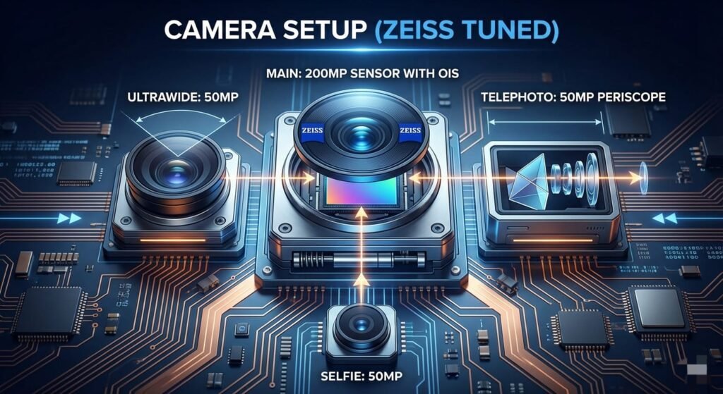 – Rear: 200MP main sensor with OIS + 50MP ultrawide + 50MP periscope telephoto